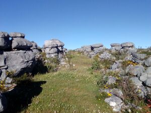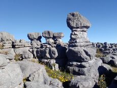 La ruta prosigue por un amplio sendero delimitado por pequeños muros de piedra, en épocas después de lluvias abundan las flores silvestres luciendo en medio y alrededor de la senda. Tras aproximadamente medio kilómetro de faldeo, justo antes de un letrero en sentido inverso que señala la dirección de la cueva, la presente ruta dejó la senda principal para doblar a la izquierda, (waypoint izq), buscando el filo donde ya comienzan a observarse las primeras formaciones rocosas de interés.
